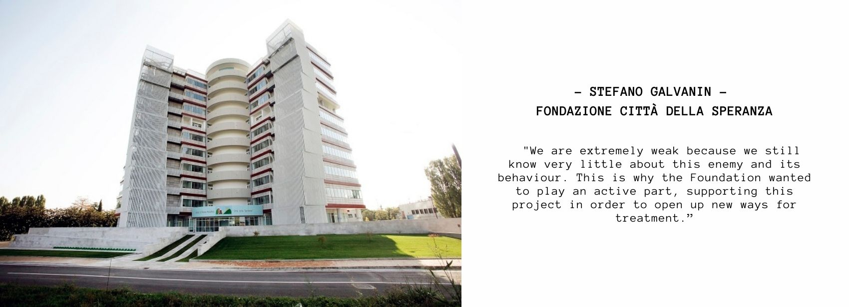 "We are living in difficult times," observes Stefano Galvanin, president of Città della Speranza. "Unfortunately, we are extremely weak because we still know very little about this enemy and its behaviour. This is why the Foundation wanted to play an active part, supporting this project in order to open up new ways for treatment".