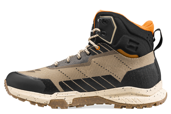 El corte en tejido Jacquard reciclado ofrece flexibilidad y resistencia gracias a la significativa reducción de costuras y a la incorporación de refuerzos antiabrasión en las zonas más expuestas, aumentando así su durabilidad. En la versión Mid, con una altura de 15 cm, el cuello es más alto y flexible, proporcionando un soporte preciso al tobillo, esencial en terrenos irregulares y pedregosos.